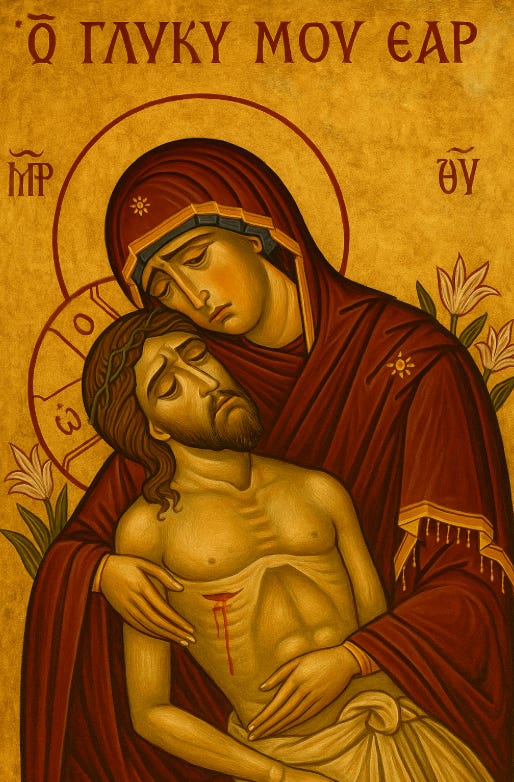 La procesión culmina en un momento conmovedor: la imagen de la Virgen María sosteniendo a su hijo muerto, cantando con tristeza, “Ω γλυκύ μου έαρ, γλυκύτατόν μου τέκνον, πού έδυ σου το κάλλος;” – "¡Oh mi dulce primavera, mi dulcísimo hijo! ¡¿Dónde se ha marchitado tu hermosura?!".