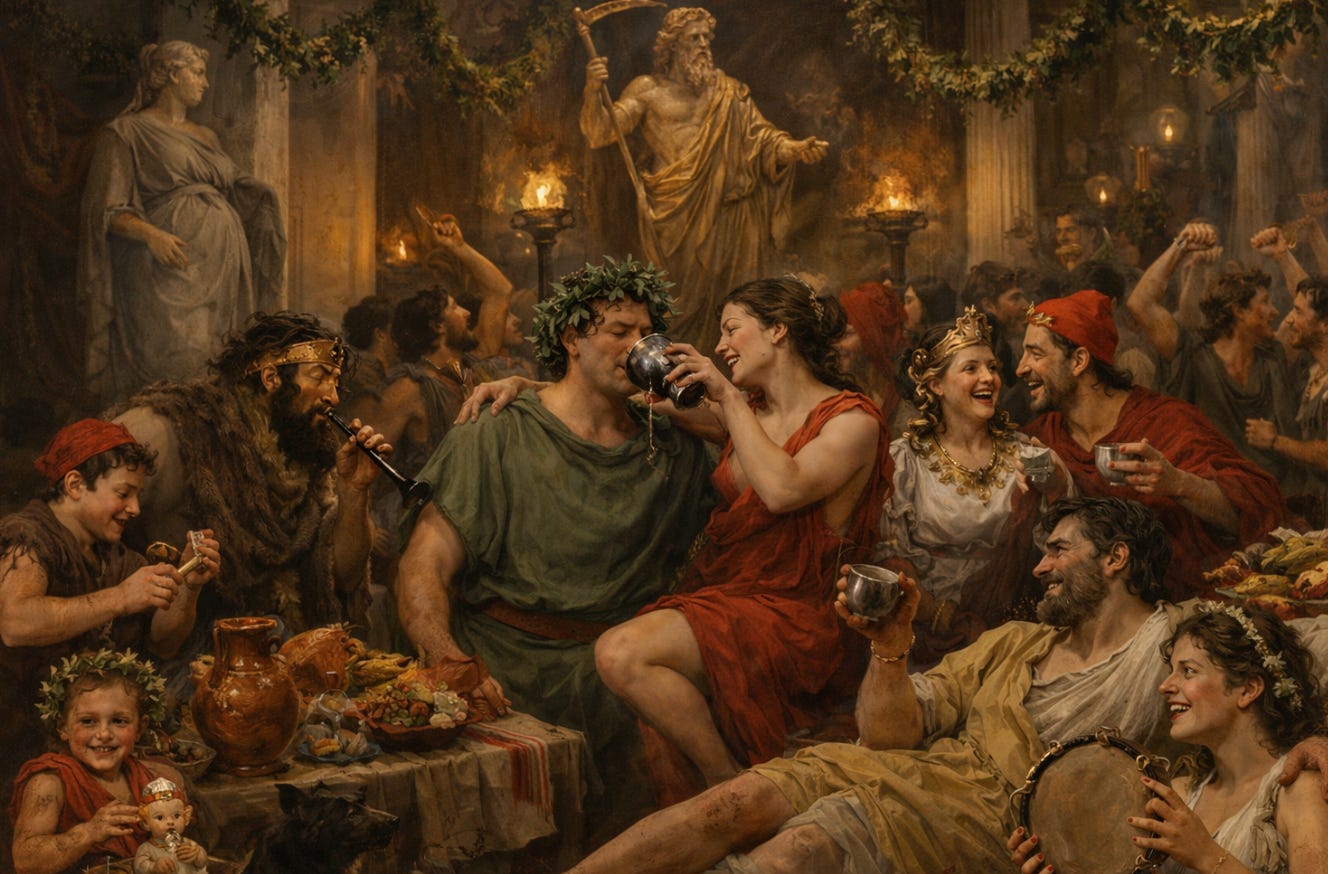 Saturnalia duraba 7 días. Se suspendían las jerarquías. Podías insultar a tu patrón, beber hasta perder la cuenta. Todo lo prohibido el resto del año tenía una semana de permiso.